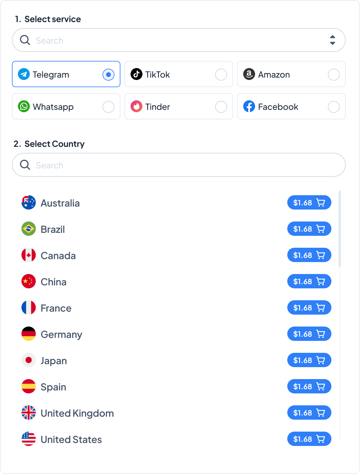 Pick the country and service you need, and get a virtual number for receiving OTP codes.
